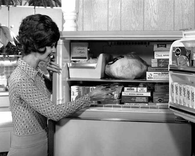 Caption: Coldspot refrigerator with reversible door hinges, 1973.