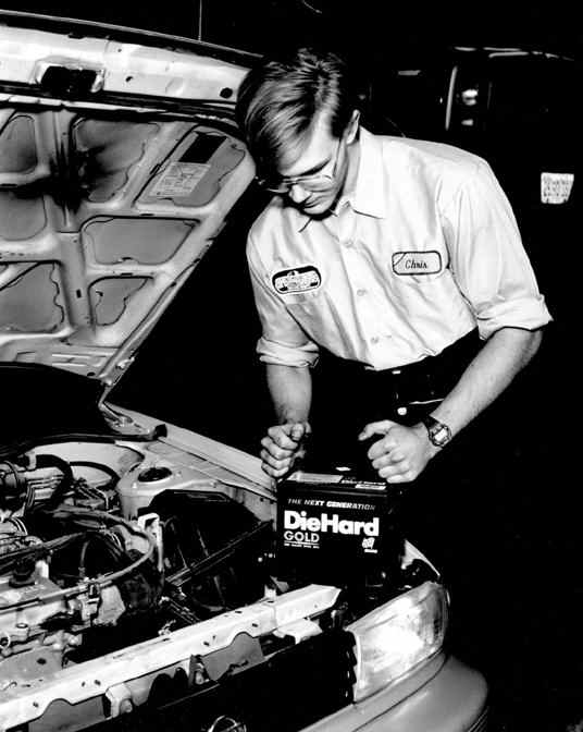 Caption: Mechanic with a DieHard Gold battery, 1994.