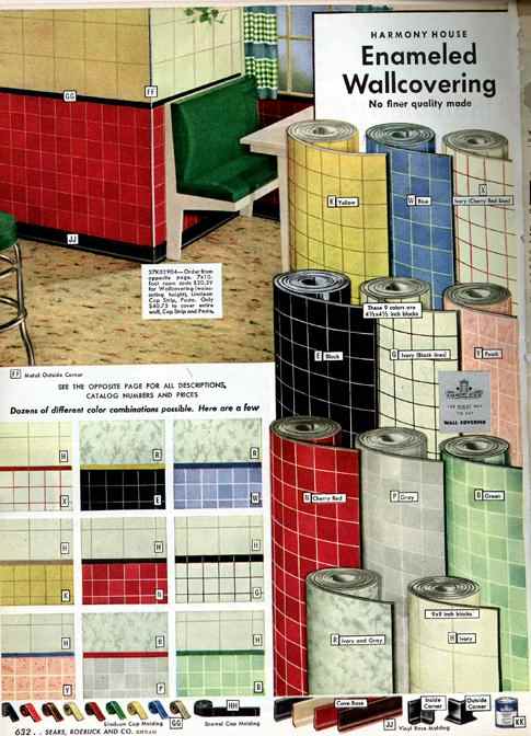 Caption: Catalog advertisement, Harmony House enameled wallcovering, 1951.