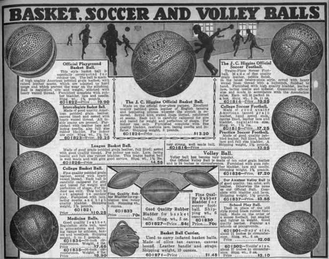 Caption: Catalog advertisement, J.C. Higgins soccer balls, basketballs, volleyballs and medicine balls, 1920.