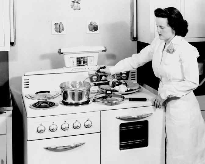 Caption: Technician with a Kenmore range in the Sears testing laboratories, 1946.
