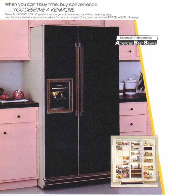 Catalog advertisement, Kenmore black-on-black refrigerator, 1985.