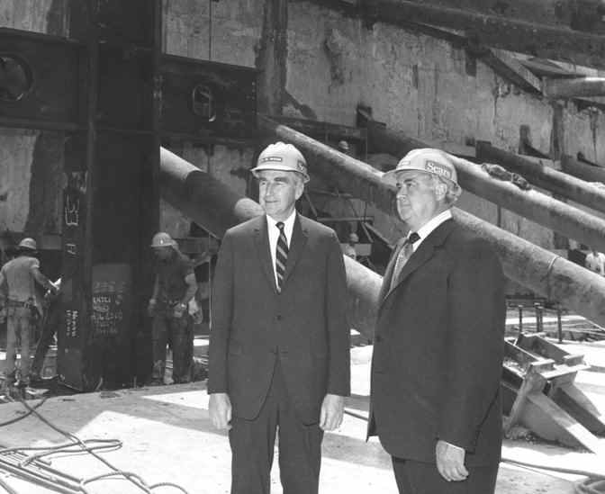 Caption: (l to r) Arthur M. Wood and Gordon Metcalf at the Sears Tower construction site, ca. 1971.